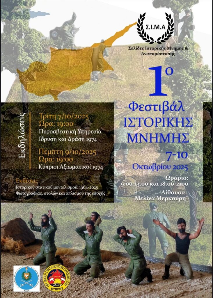 Άνοιξε τις πύλες του για το κοινό το 1ο Φεστιβάλ Ιστορικής Μνήμης που διοργανώνεται από τις Σελίδες Ιστορικής Μνήμης και Αναπαράστασης (ΣΙΜΑ). Το φεστιβάλ πραγματοποιείται στην Αίθουσα “Μελίνα Μερκούρη” στη Λευκωσία από τις 7 μέχρι τις 10 Οκτωβρίου και το ωράριο είναι 9:00-13:00 και 18:00-21:00.