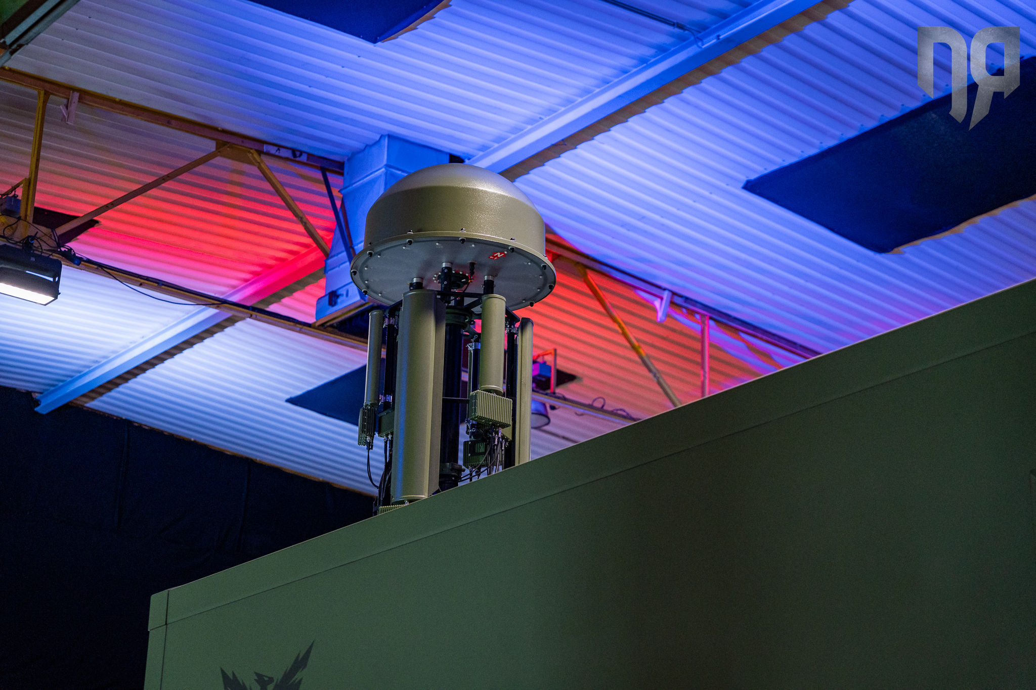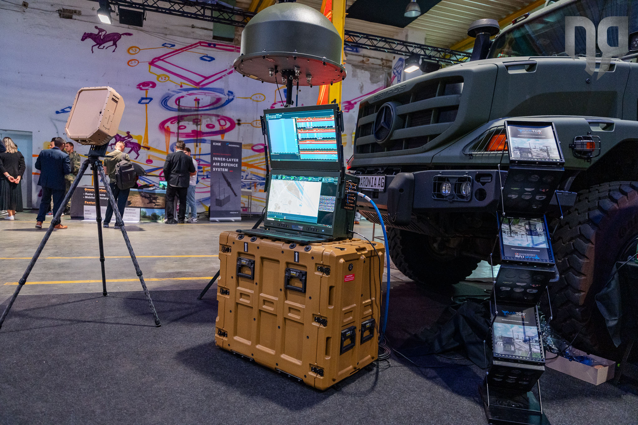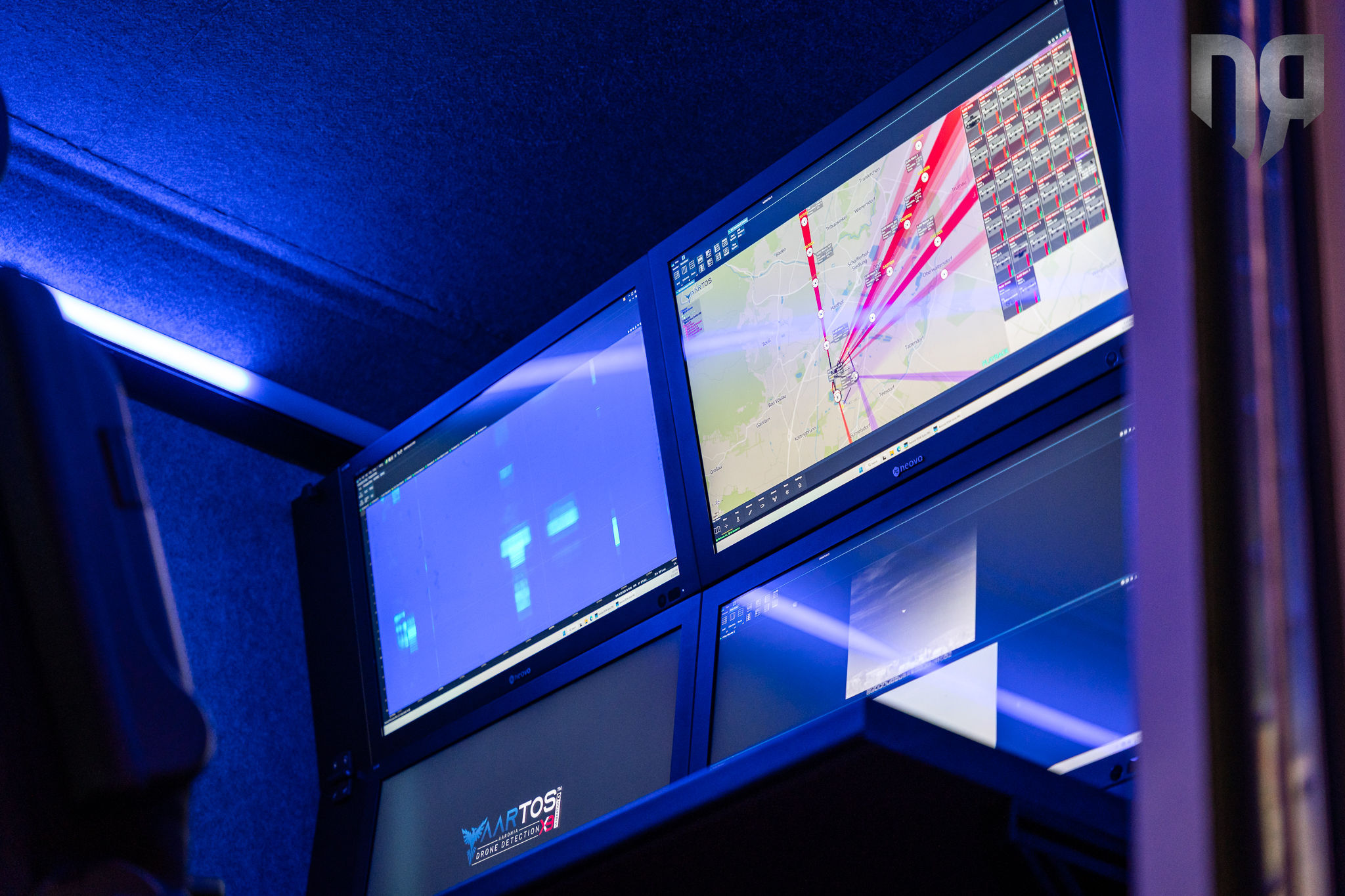 Το σύστημα AARTOS με ευέλικτο λογισμικό C2 και μονάδα ενσωμάτωσης αισθητήρων AARTOS X9 (κεντρικά) το ραντάρ 4D για UAV (αριστερά) και την κεραία παθητικού εντοπισμού IsoLOG 3D (πίσω από το C2) σε φορητή διαμόρφωση